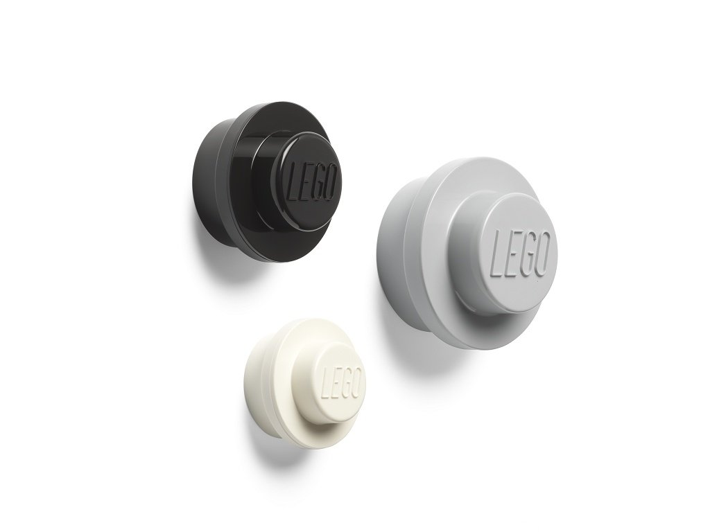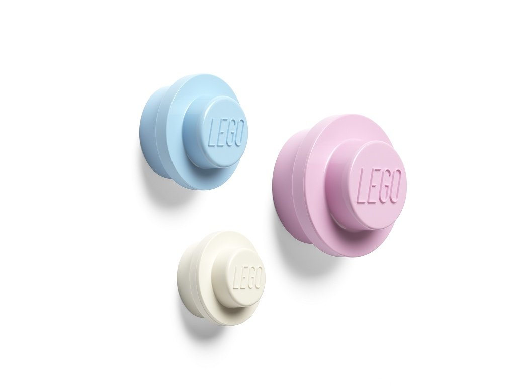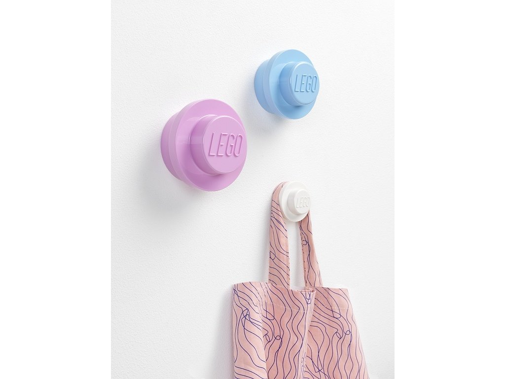 Nástenné vešiaky Lego dodajú detskej izbe alebo inej časti domu zábavný a hravý nádych. Možno ich usporiadať do ľubovoľných kompozícií a použiť ako nástenné vešiaky alebo nástenné dekorácie. Nástenné vešiaky Lego sa predávajú v sade po troch kusoch: sada sa skladá z troch rôznych farieb a veľkostí.