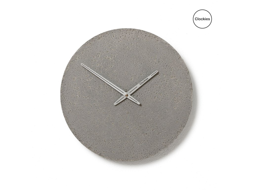 Sivé nástenné hodiny v tvare kruhu so striebornými ručičkami z eloxovaného hliníka s gravírovaním.