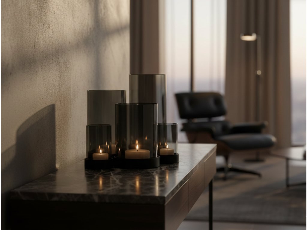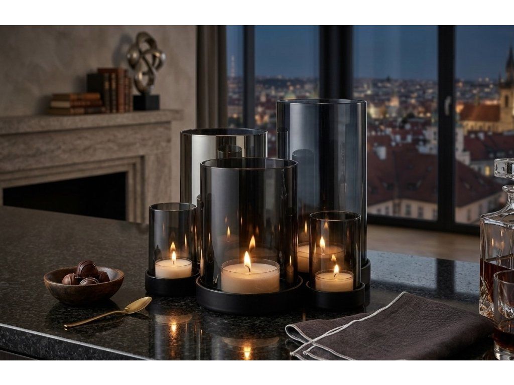 Straťte sa v záplave svetla s novým unikátnym svietnikom od značky Philippi. Svietnik sa skladá z piatich valcov rôznych veľkostí, do ktorých presne pasujú čajové sviečky. Ich plamienky rozohrajú monumentálnu hru svetla a odrazov, a vy tak budete mať pocit, že svetielok je tam oveľa viac. Tmavé sklo so zrkadlovým efektom dodáva svietniku neobvykle úchvatné vyznenie. Valce sú zasadené do základnej z popráškovanej ocele, ktorá nádherne kontrastuje s lesklým povrchom valcov.