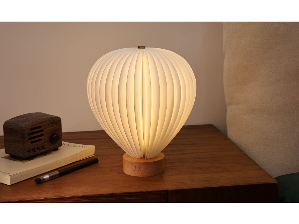 Prenosná, bezdrôtová a plne stmievateľná lampa je usadená na pevnom drevenom podstavci, ktorý dizajn prirodzene ukotvuje. Mäkké rozptýlené svetlo zvýrazňuje kresbu a štruktúru prírodného dreva a vytvára hrejivú, atmosférickú náladu – od tlmeného večerného svitu až po jasnejšiu, sústredenú atmosféru.