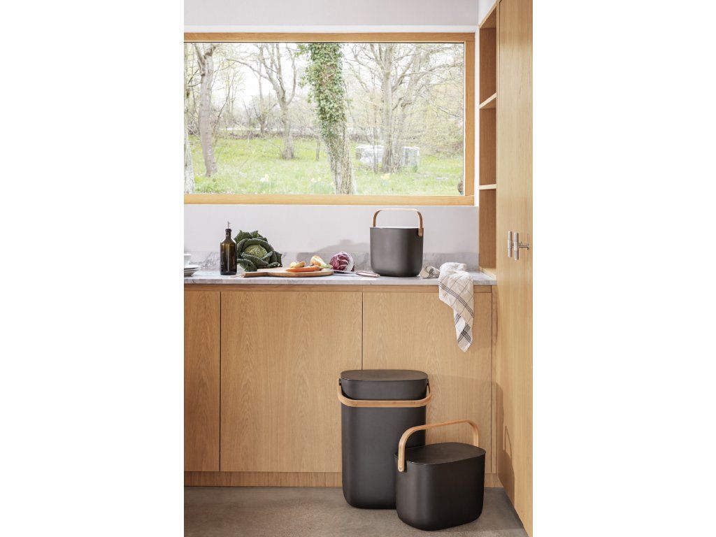 Integrované madlá uľahčujú premiestňovanie koša. Ten je vyrobený z ekologického recyklovaného plastu a bambusu.