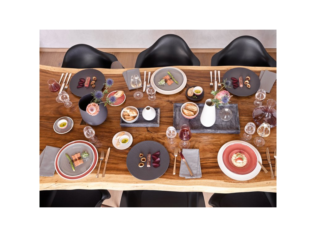 Kolekcia obsahuje 22 produktov, ktoré možno priebežne dokupovať. Okrem klasických okrúhlych tanierov vám odporúčame pozrieť si taniere hranaté, ktoré sú ako stvorené pre ultramodernú gastronómiu. Vašej pozornosti by nemala uniknúť ani sada misiek na dip s podnosom, ktorá sa stane praktickou ozdobou každého stola.