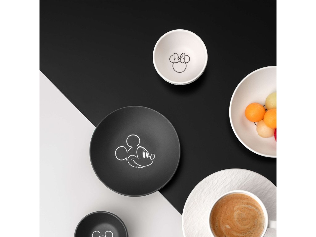 Matný porcelán s charakteristickou štruktúrou inšpirovanou prírodnou bridlicou vytvára výrazný kontrast k jemnému, minimalistickému motívu Mickeyho. Čierna alebo biela varianta podčiarkuje grafickú čistotu celej kolekcie a dodáva jej súčasný, ľahko urban nádych.