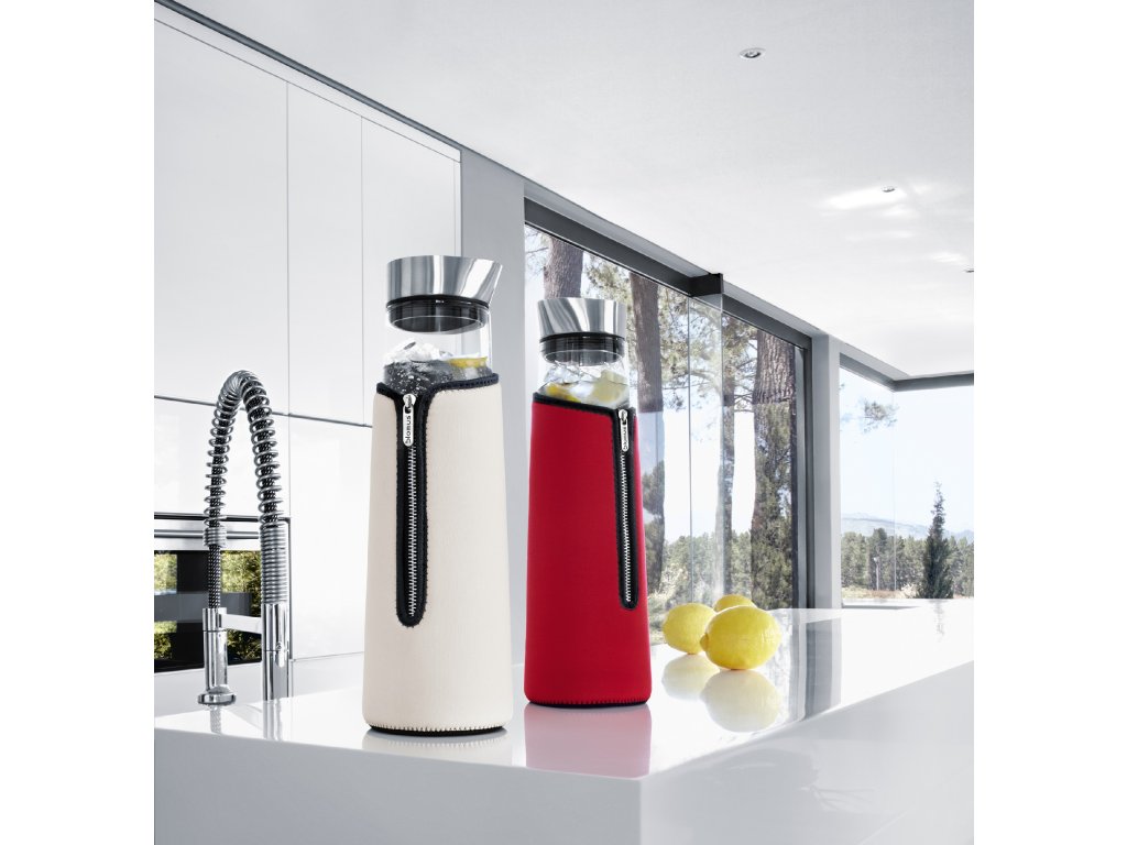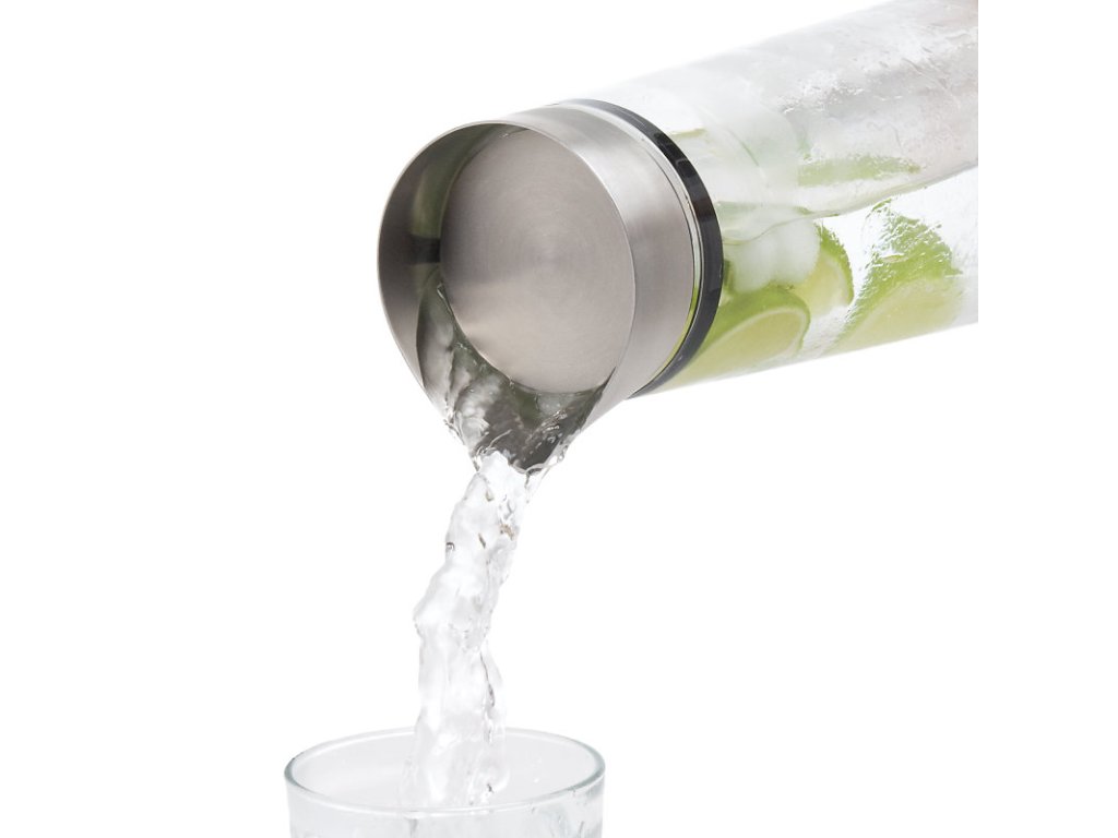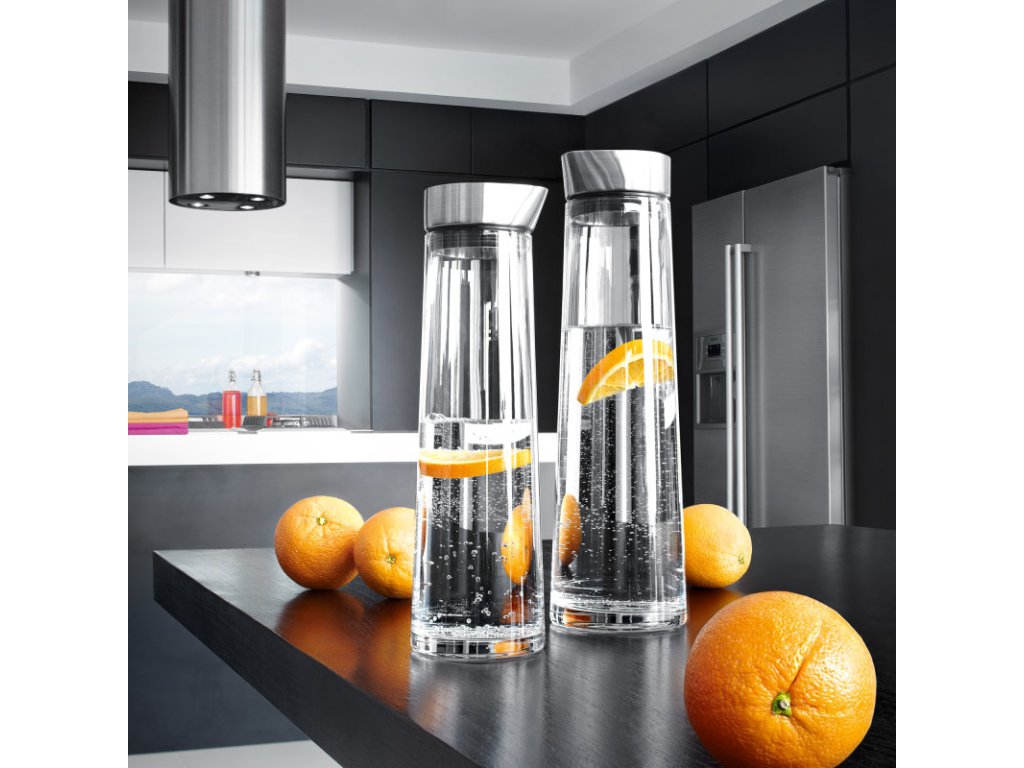 Karafa na vodu ACQUA je vyrobená v ultra jednoduchom ale dômyselnom dizajne. Jej elegantný štíhly tvar bude vyzerať dekoratívne na vašom jedálnom stole. Zároveň sa pohodlne vojde do dverí väčšiny chladničiek. Nerezové veko je inovatívna, má integrovaný výtok pre ľahšiu manipuláciu. S jeho pomocou môžete ľahko nalievať aj do malých pohárov, neodkvapkáva. Prúd vody je usmernený presne tam, kam potrebujete, a plátky ovocia či kúsky ľadu zostanú vnútri karafy.