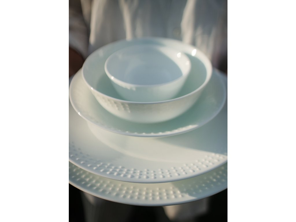 Po okraji jedálneho taniera Snø s priemerom 27 cm môžete zahliadnuť a cítiť jemný vzor drobných vločiek, ktoré pokrývajú okraje priesvitného kostného porcelánu - usporiadané náhodne, tak, ako to vie len príroda. Tento tanier je ideálny na servírovanie tých najlahodnejších slávnostných pokrmov aj na každodenné stravovanie. Jedálenský tanier Snø je súčasťou elegantnej kolekcie riadu, ktorá vyžaruje dôstojnosť a eleganciu.
