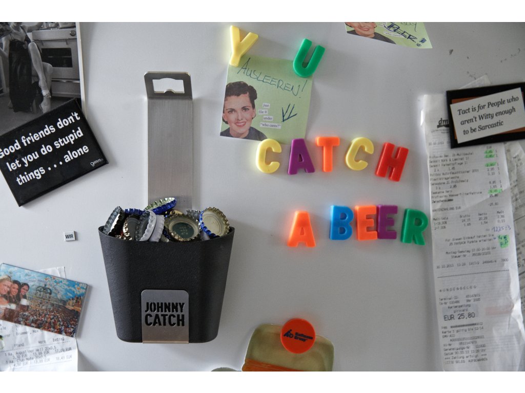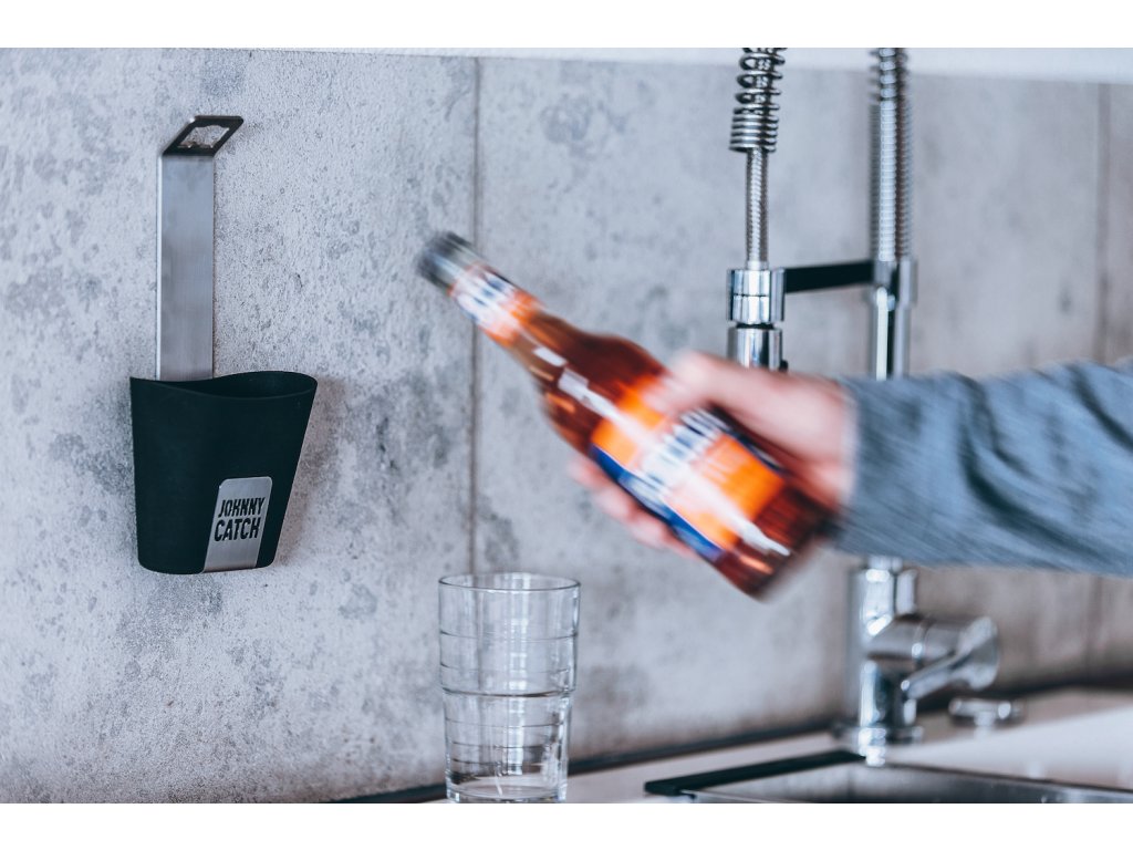 Okrem hľadania otvárača môžete dať tiež zbohom otravnému zakopávaniu o kovové viečka, ktorá zrovna spadla zo stola alebo sa zakotúľala pod stoličku. Johnny Catch Cup je totiž vybavený nádobkou, do ktorej sa zmestí až 60 zátok.