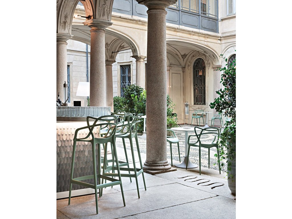 Dlhšie a štíhlejšie nohy aj menší a úhľadnejší sedák z neho robia o niečo krehkejšiu „sestričku“ pôvodnej jedálenskej stoličky Masters. Ale sexy je úplne rovnako. Vonku, pri barovom posedení blízko bazéna, rovnako ako vo vnútri, napríklad v kuchyni, pri dlhých víkendových raňajkách.