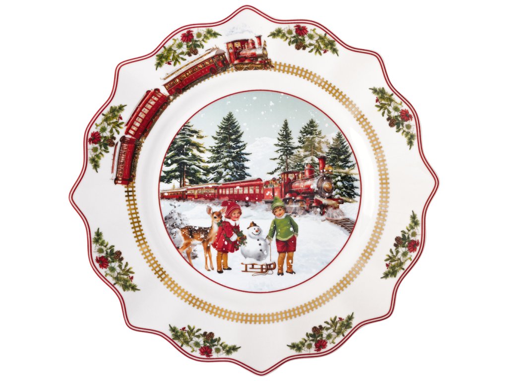 Začnite tohtoročný advent s limitovanou edíciou Annual Christmas Edition 2025 , ktorá očarí každého milovníka tradičných Vianoc. Dezertný tanier s jemne vlnitým okrajom a červenými linkami zdobí nostalgický motív zimnej krajiny – deti stavajúce snehuliaka, zasnežené domčeky a Polárny expres prechádzajúcou krajinou . Zlato dekorované koľaje dodávajú celej scéne výnimočný nádych a robia z taniera zberateľský kúsok so skutočným vianočným kúzlom.